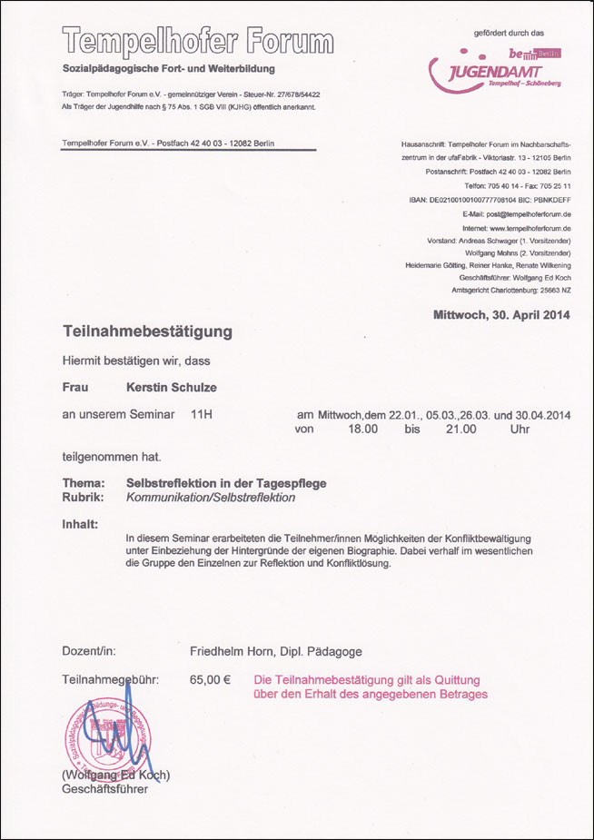 Um neue Erkenntnisse und Entwicklungen in unsere pädagogische Arbeit einfließen zu lassen, nehme ich regelmäßig an sozialpädagogischen Fortbildungskursen teil.