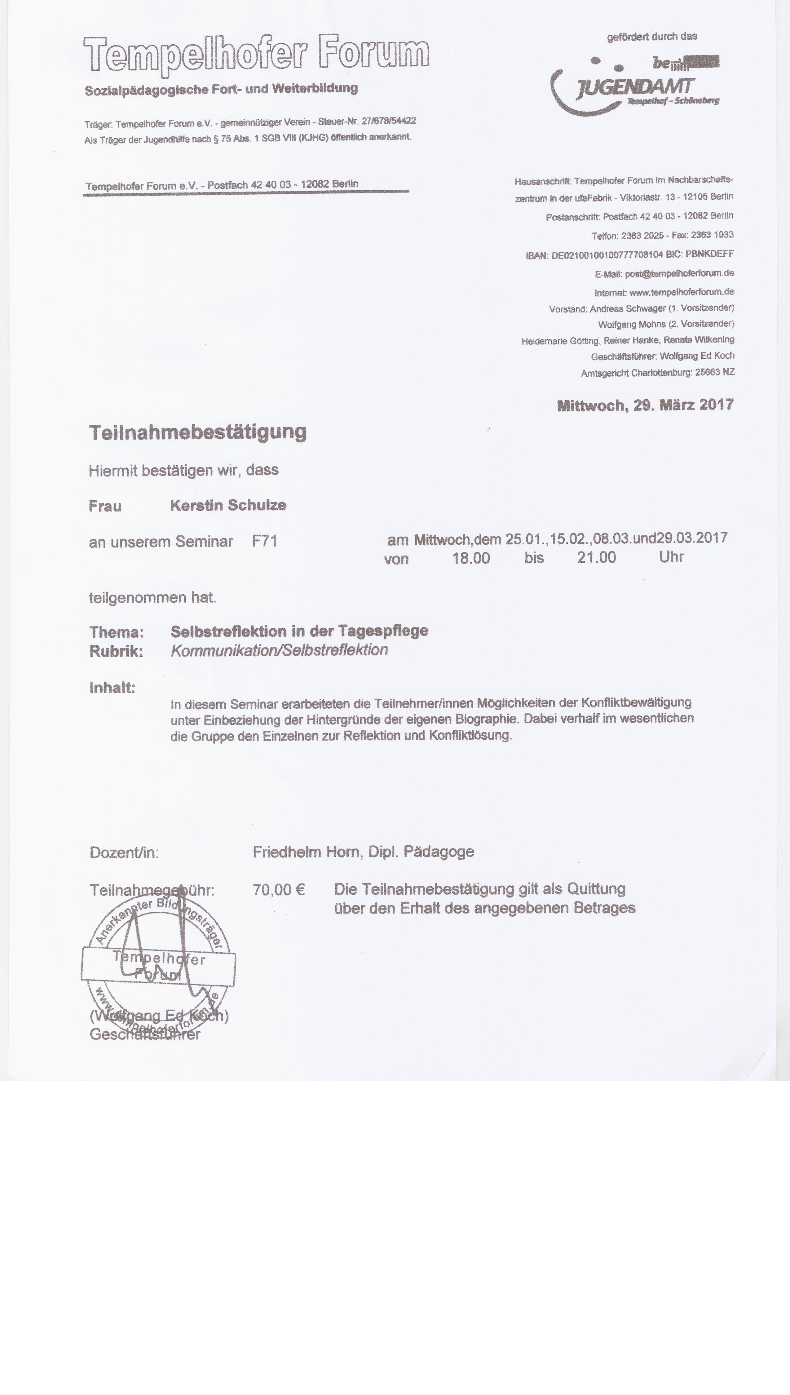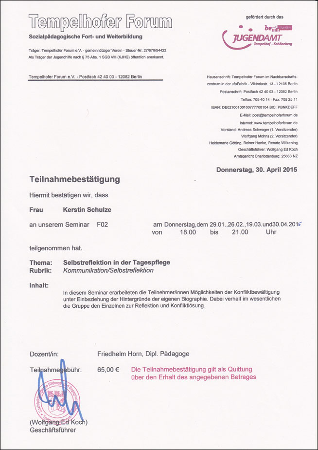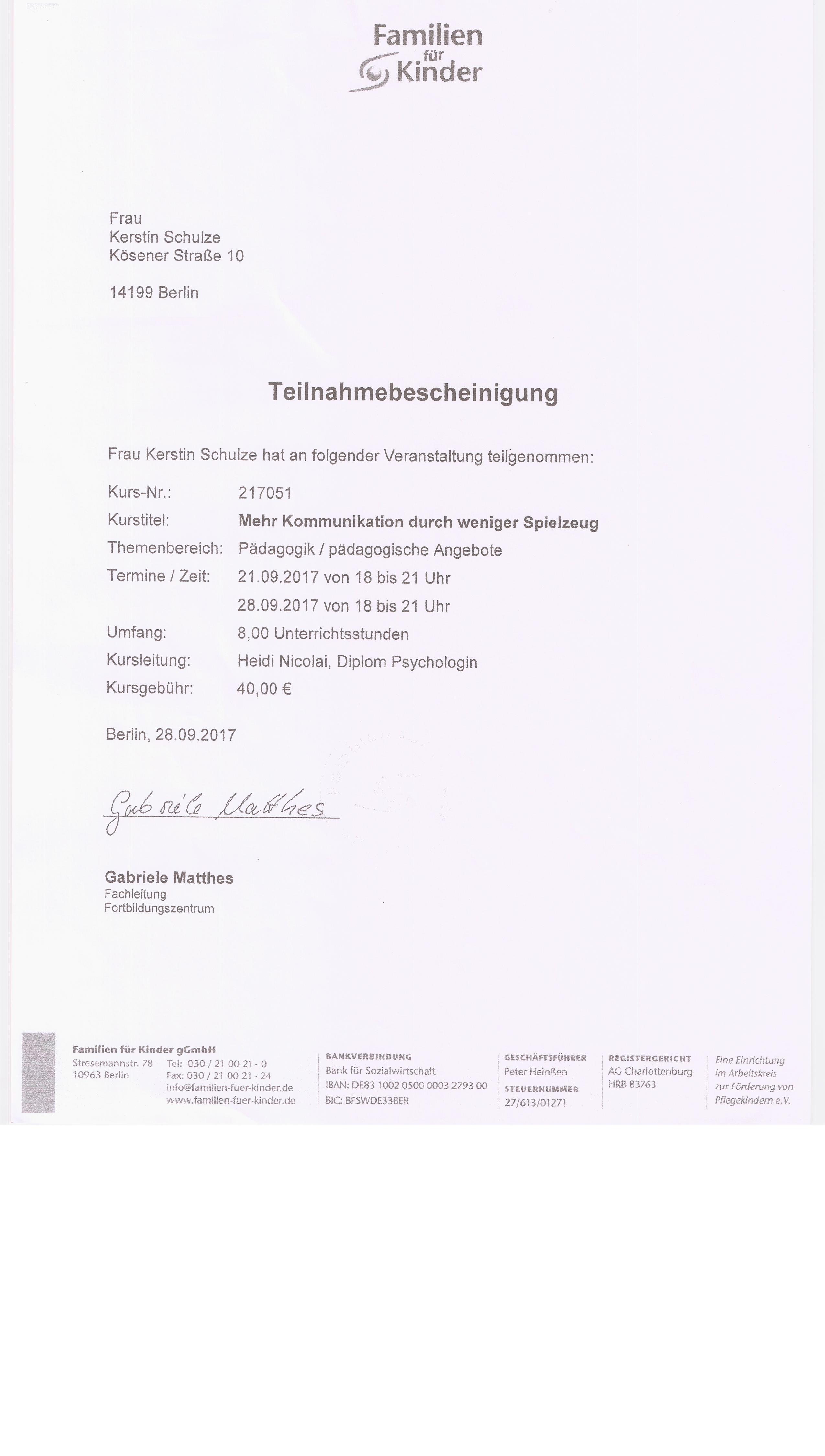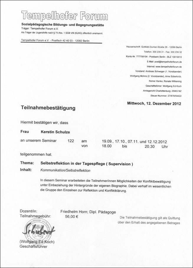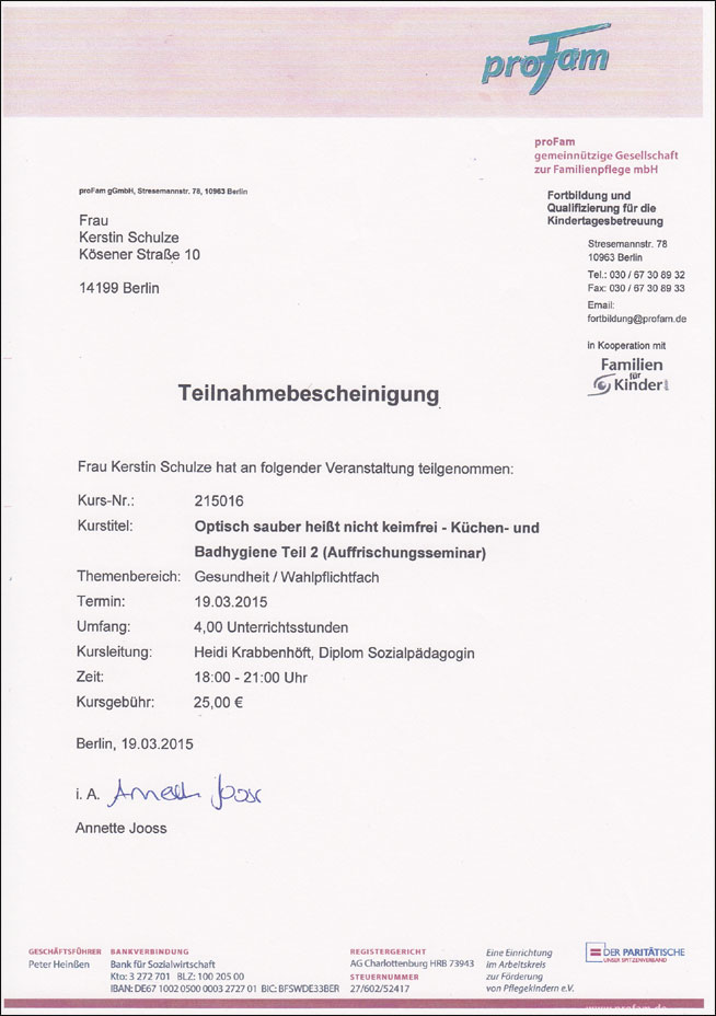 Um neue Erkenntnisse und Entwicklungen in unsere pädagogische Arbeit einfließen zu lassen, nehme ich regelmäßig an sozialpädagogischen Fortbildungskursen teil.